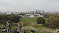 verdade, finalmente cheguei ao tão esperado espaço. Escusado será dizer que havia centenas de pessoas a querer tirar foto perto do relógio (essa parte era grátis). Mas para entrar no Royal Observatory tinha que se pagar uma Royal Entrada. Ainda pensei duas vezes em entrar, mas depois pensei que a linha do Meridiano, (que se vê bem na segunda foto em baixo, onde as pessoas estão) não acaba no fim do edifício e visualmente segui a linha até ao final, comecei a contornar o edifício... até que chego à parede onde se encontra a continuação da linha e nessa mesma parede está feita uma marcação, para os mais pobres fazerem o registo em como já estiverem com um pé no ocidente e outro no oriente. Aí tinha pouca gente e até deu para pedir a um casal francês para me tirar uma foto, pena que estava um bocadinho de vento e fiquei despenteada, mas também já é normal... 😃. Ainda na segunda foto vê-se uma bola vermelha no topo de uma casa, chamada de Time Ball. Esta bola começou a funcionar em 1833 e funciona até hoje. O seu principal objetivo era orientar os navegadores e as pessoas que para ela olhavam. Funciona da seguinte maneira, às 12:55 a bola sobe até metade do seu mastro, às 12:58 faz o restante caminho atingindo o topo e pontualmente às 13:00 ela cai, fornecendo assim o sinal que os navegadores precisavam. Tive pena de não ter estado lá a essa hora para ver se andava adiantada ou atrasada 😉 .